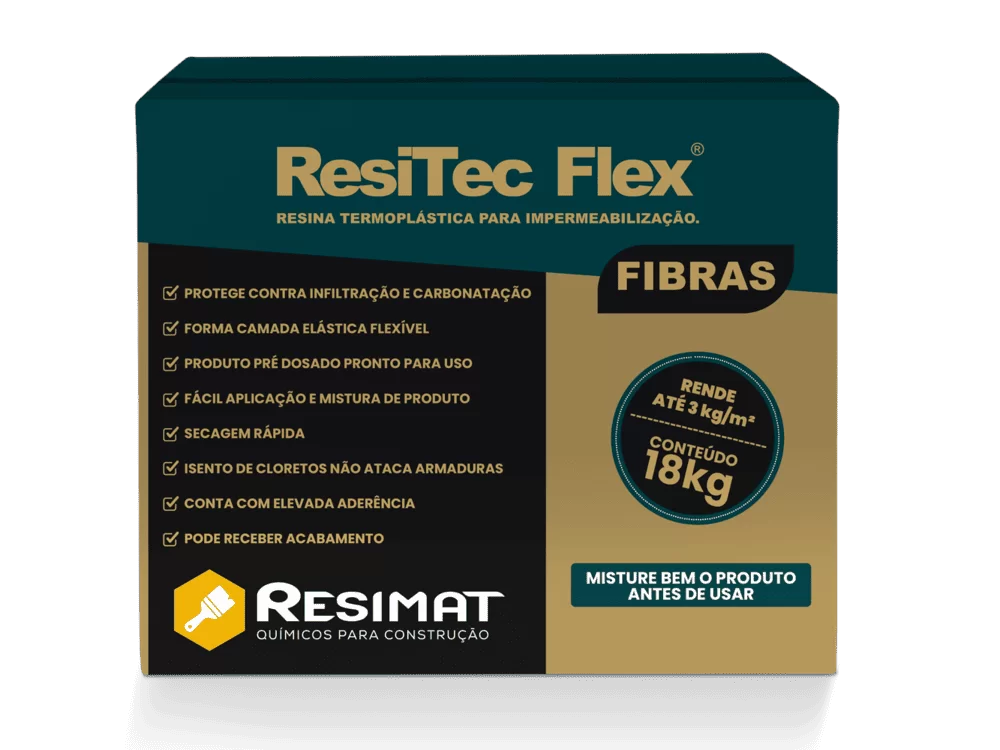 Resitec-Flex argamassa termoplastica com fibras é um revestimento impermeabilizante e protetor, flexível, com fibras sintéticas, bicomponente (A+B) , à base de cimento, areias selecionadas e resina acrílica. Indicado para a impermeabilização de concreto, argamassa ou alvenaria. Produto com excelente aderência e estanqueidade pronto para o uso e pré-dosado, requer apenas homogeneizar os dois componentes.