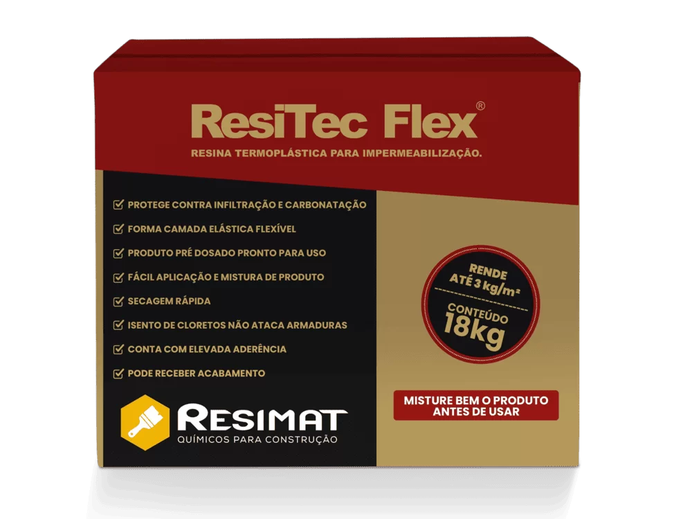 Resitec-Flex argamassa termoplástica flexível impermeabiliza e protege, bicomponente (A+B) , à base de cimento, areias selecionadas e resinas acrílicas. Indicado para a impermeabilização de concreto, argamassa ou alvenaria. Produto com excelente aderência e estanqueidade pronto para o uso e pré-dosado, requer apenas homogeneizar os dois componentes. É usado em impermeabilização de reservatórios e piscinas.